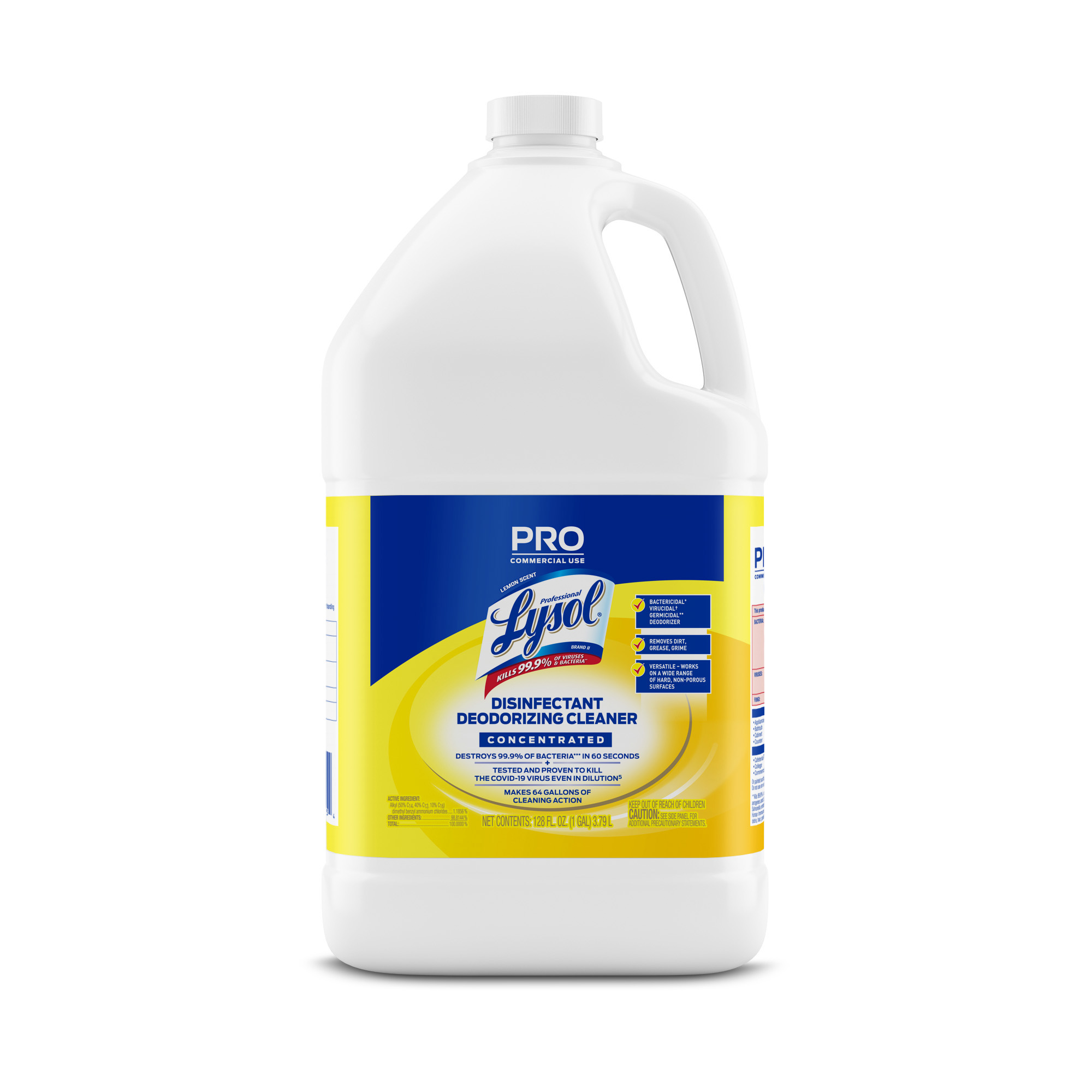 Optimize cleaning efficiency and meet commercial disinfection needs with Professional Lysol Disinfectant Deodorizing Cleaner. Give cleaning crews a versatile formula that cleans, disinfects, and deodorizes. This economical, concentrated solution makes up to 64 gallons of cleaning action that crews can use on a wide range of hard, non-porous surfaces when used as directed. To disinfect, dilute 1 oz. of product with 5 oz. of water. This product is bactericidal, virucidal, and germicidal when used as directed. Destroy 99.9% of bacteria in 60 seconds. Remove dirt, grease, and grime, and leave behind a familiar lemon scent.