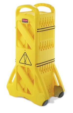The Rubbermaid Commercial Mobile Barrier is easy to use, easy to see, easy to move, and easy to store. The barrier is 13 feet long with 16 articulating panels that work in multiple configurations such as straight, curved, or circular. 4 locking straps keep the barrier closed to store compactly and non-marking wheels make it quick to move and reposition. Designed for indoor use, this caution sign barrier arrives fully assembled. ANSI/OSHA compliant color.