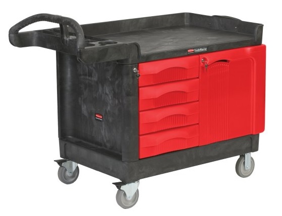 The TradeMaster Cart with 4 Drawers and Cabinet is a complete tool storage and mobile workbench system, with shelving and cabinet configurations to meet any storage needs. The mobile work station helps seamlessly and efficiently transport supplies to improve work productivity by eliminating the need for multiple trips going from site-to-site.