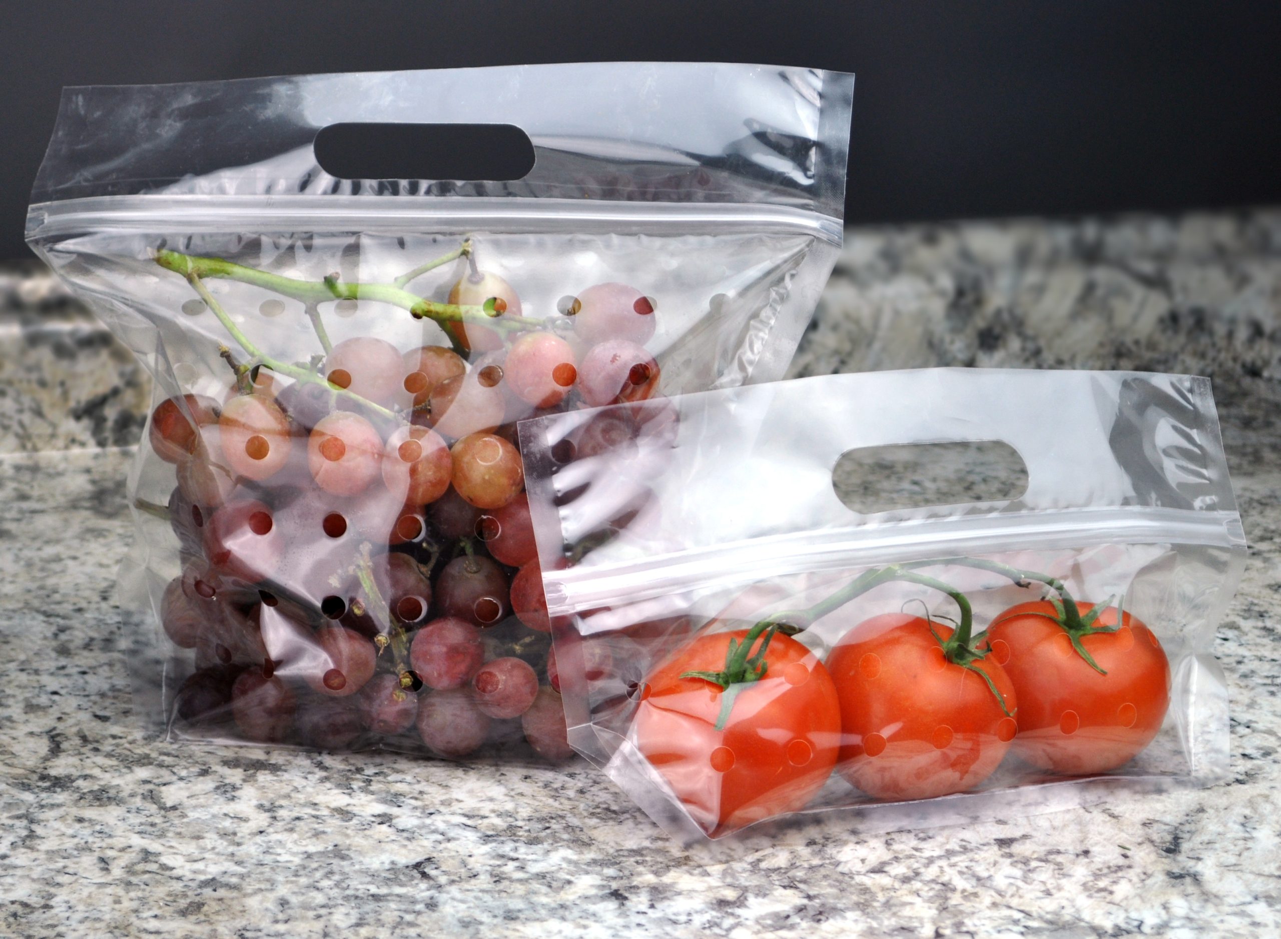 These vented produce pouches are excellent for retail produce applications because the crystal-clear Polypropylene material makes produce look great, and the bags have vent holes that help keep the contents fresh. There’s a handy die-cut handle and zipper closure for convenience.