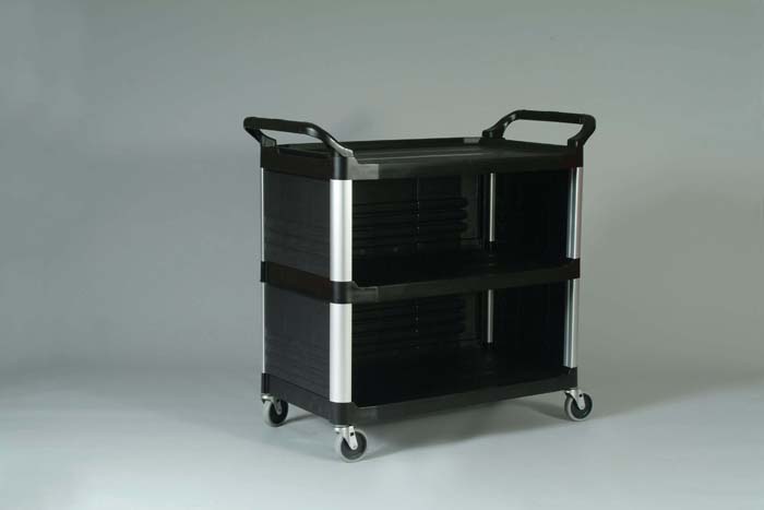 Large textured shelves hold and reduce slippage of a variety of equipment and supplies